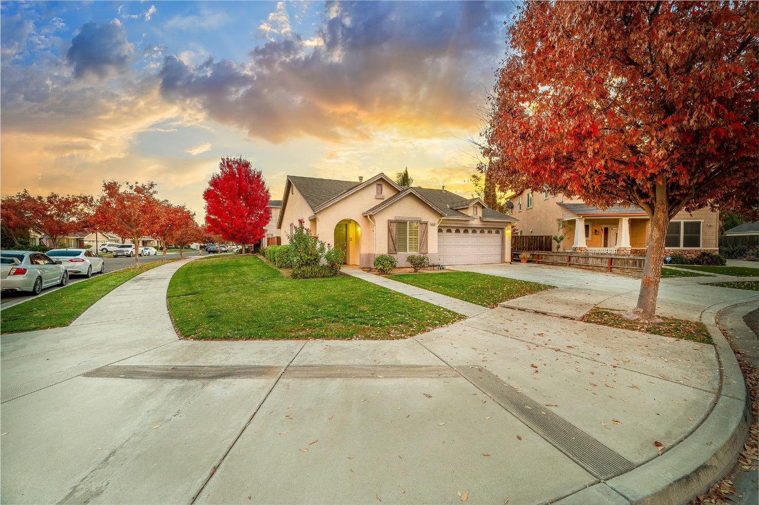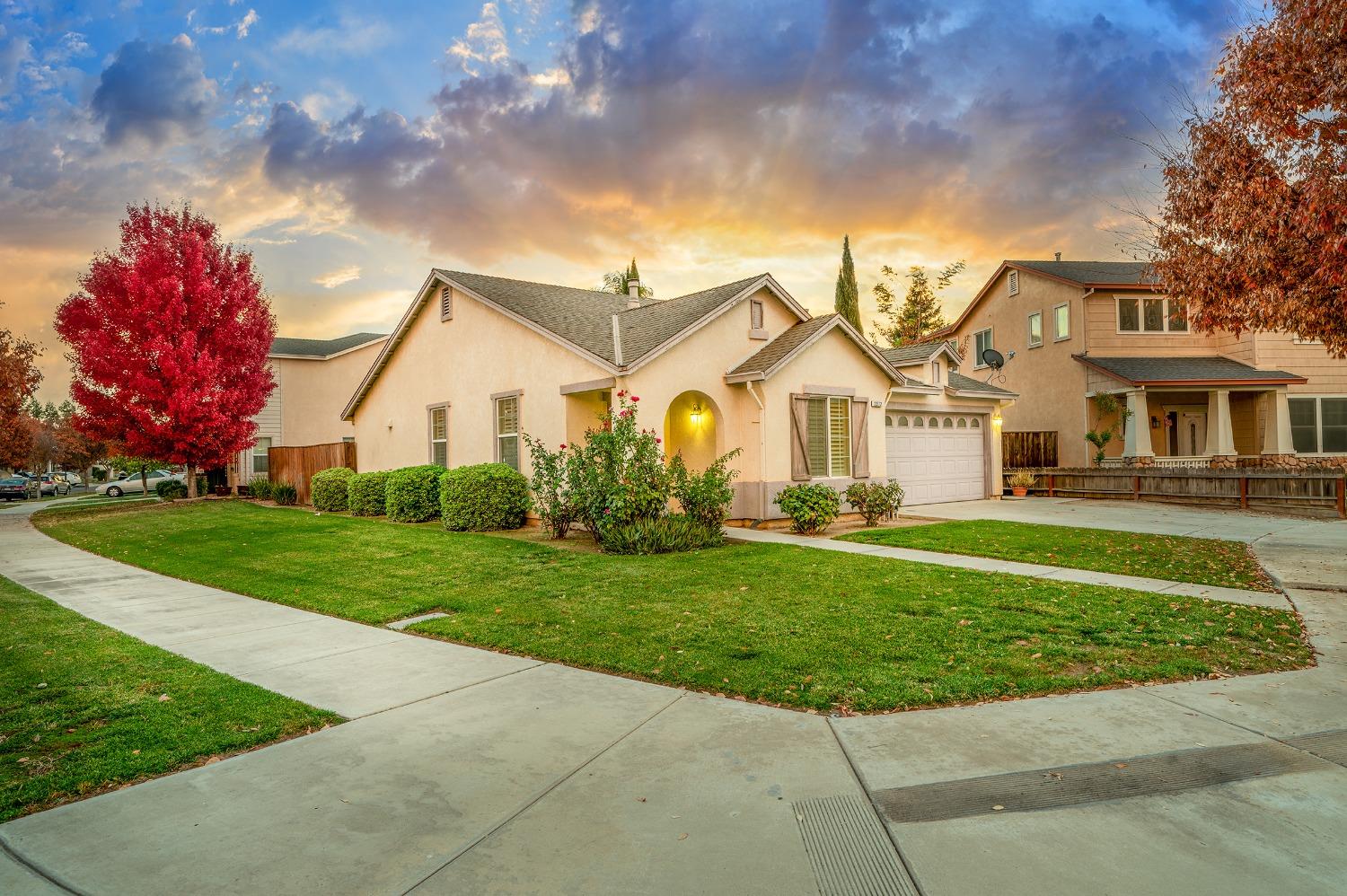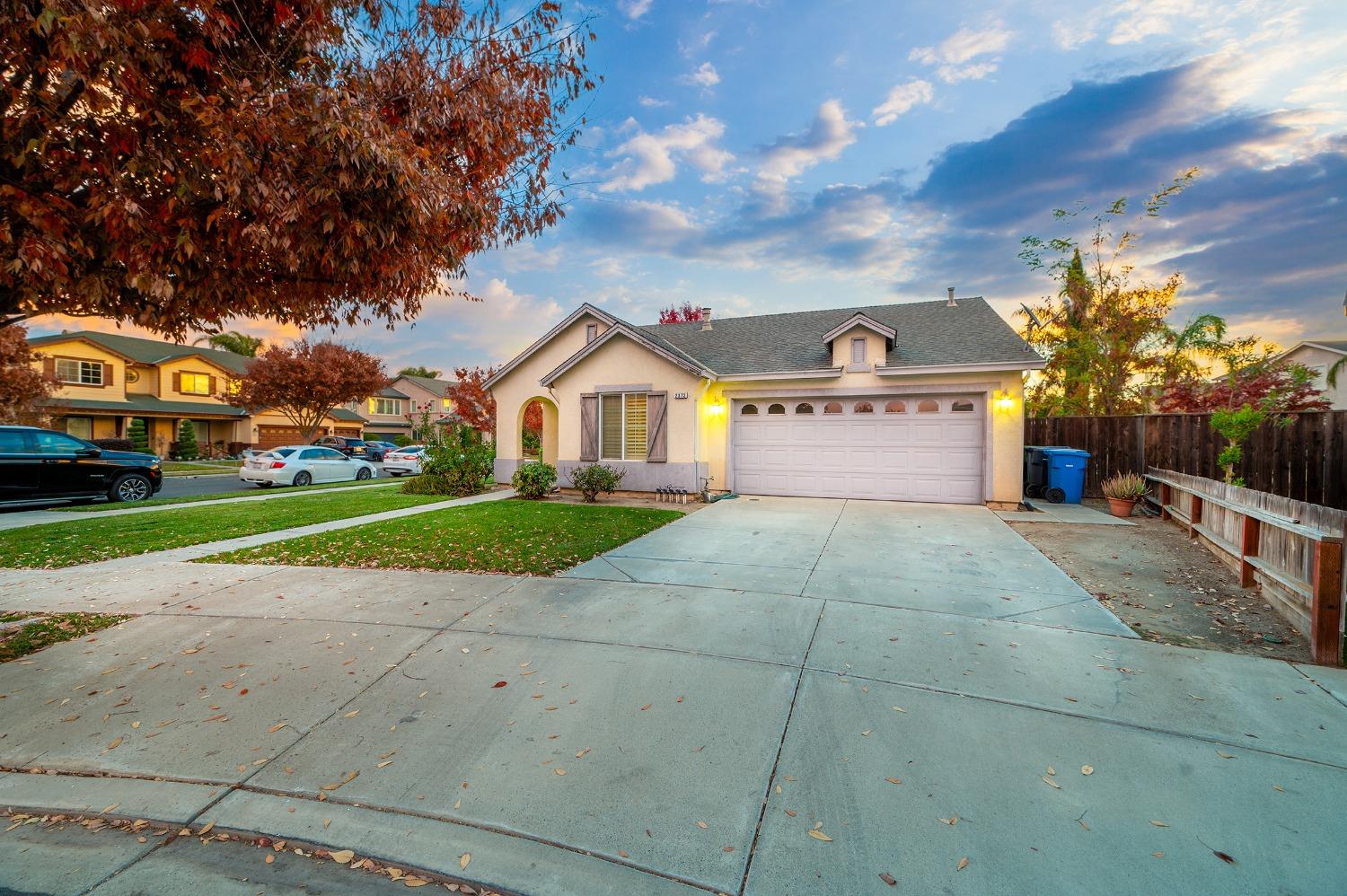Single Story Charmer in the heart of North Turlock! Soaring Cathedral Ceilings, plantation shutters, New interior paint, New Luxury Vinyl Flooring and baseboards, Intercom system with Surround Sound, Rounded Bullnose corners and Study/Den with Glass French Doors that can also be a 3rd bedroom. Spacious Kitchen with ample cabinetry storage, dining bar overlooking the Living Room make this open concept floor place feel welcoming. Large Primary Suite with French Door to your backyard access combined with walk-in closet and dual sinks make this cutie a must see. Corner Lot in a Cul-de-Sac, Close to schools, shopping, parks and minutes away from Hwy 99 access, Come, See and Fall in Love!