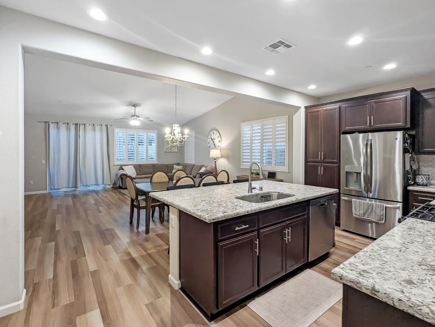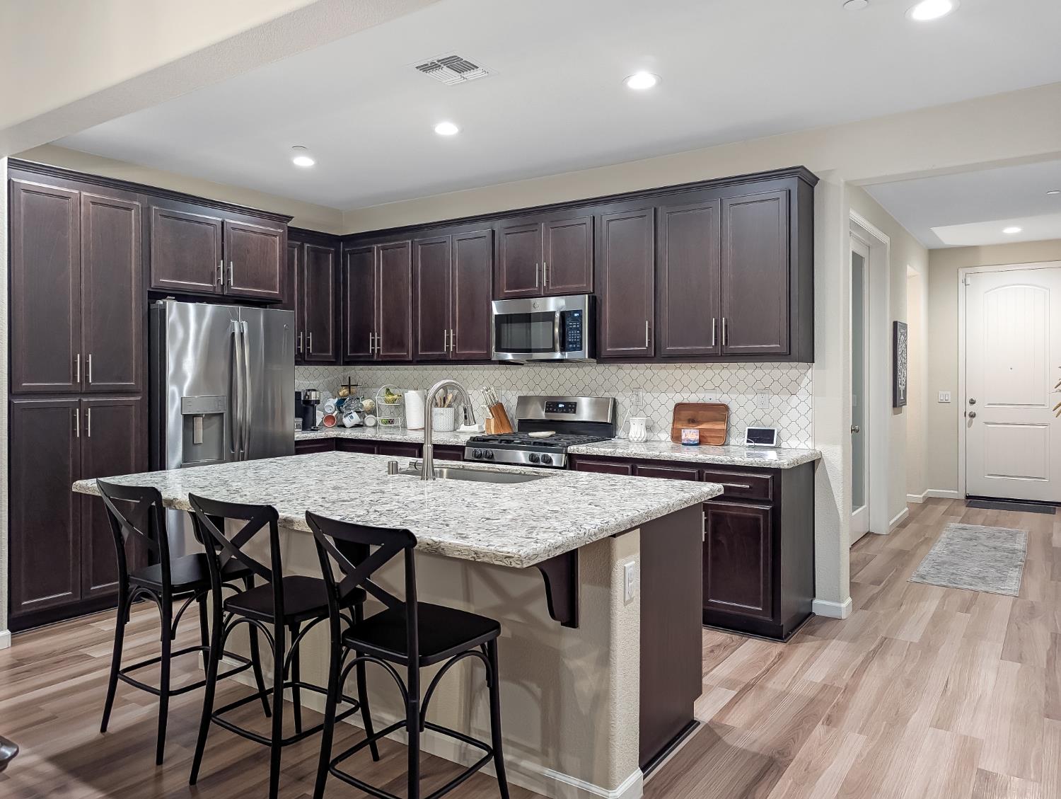Welcome to this beautiful single-story 1,944 sq. ft. home, built in 2019, featuring 3 bedrooms, 3 bathrooms, and an office in one of Modesto's desirable neighborhoods. Inside, you'll find an open-concept layout with vaulted ceilings, a spacious living area, and a stunning kitchen with a large island, sleek quartz countertops, and plenty of room to entertain. The home offers two primary suites, with the main suite featuring a walk-in closet and luxury dual vanities. Enjoy low-maintenance landscaping with artificial turf, a sprinkler system for vibrant flower beds, and a private outdoor space to relax or host. Additional features include a two-car garage and owned solar. This move-in ready gem blends comfort, function, and modern upgrades schedule your tour today!
